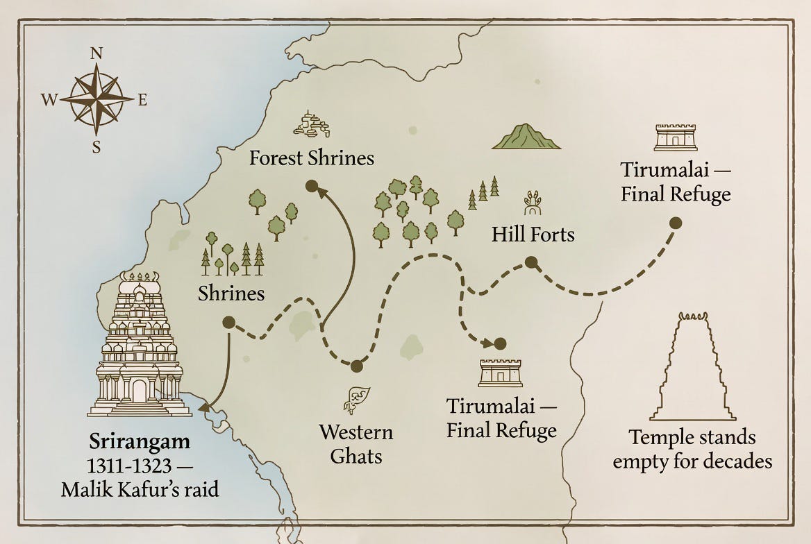 Malik Kafur’s forces swept south. The temple’s own chronicle, the Koyil Olugu, gives the event its sharpest edges: panic, the concealment of sacred icons, a massacre of devotees. The processional image of Ranganatha did not remain in Srirangam. Priests carried it away.